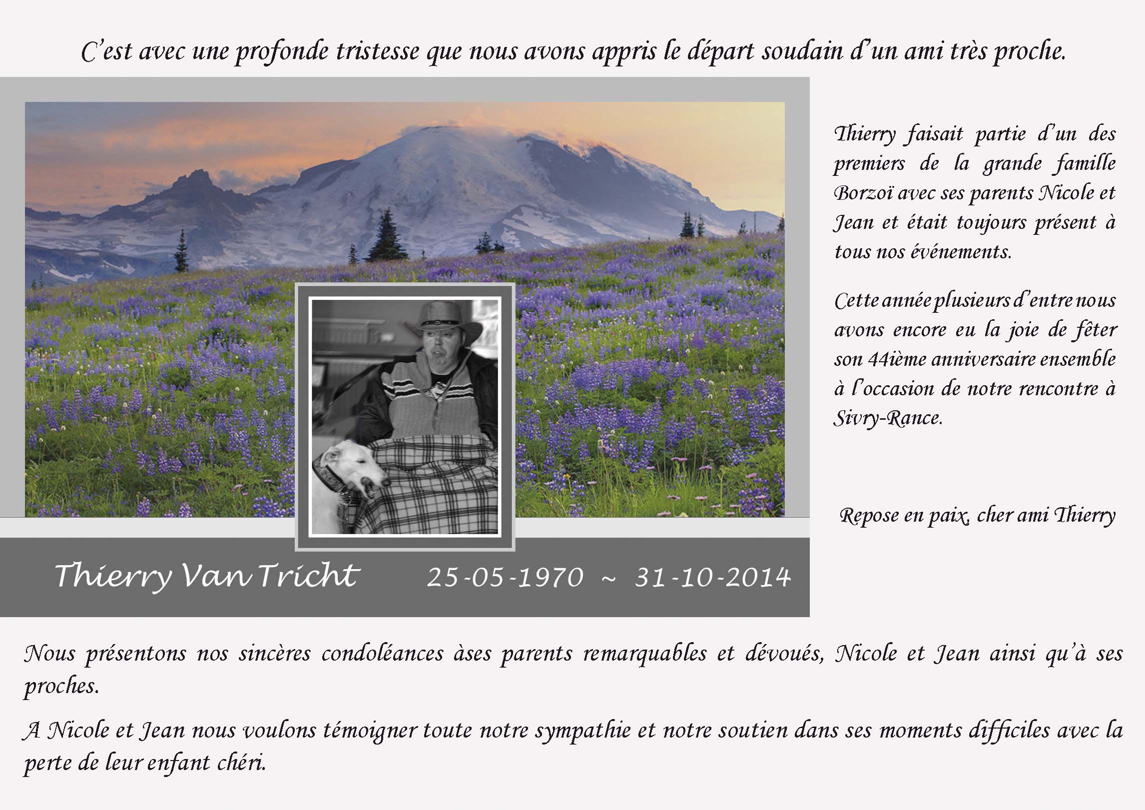 | C'est avec beaucoup de tristesse que nous vous faisons part que Fons Cuypers, est décédé très inopinément hier soir, le 9 décembre, des suites d'une crise cardiaque. Nous avons tous connu Fons comme un homme très gentil et très doux, quelqu'un de qui on peut dire sans fausse modestie « Il n'en existe qu'un comme lui ». Son plus grand plaisir était de s'occuper de ses 4 Borzoïs Vassilis, Xergeï, Dark Shadow et Gatchina, et il était particulièrement fière d'eux. |